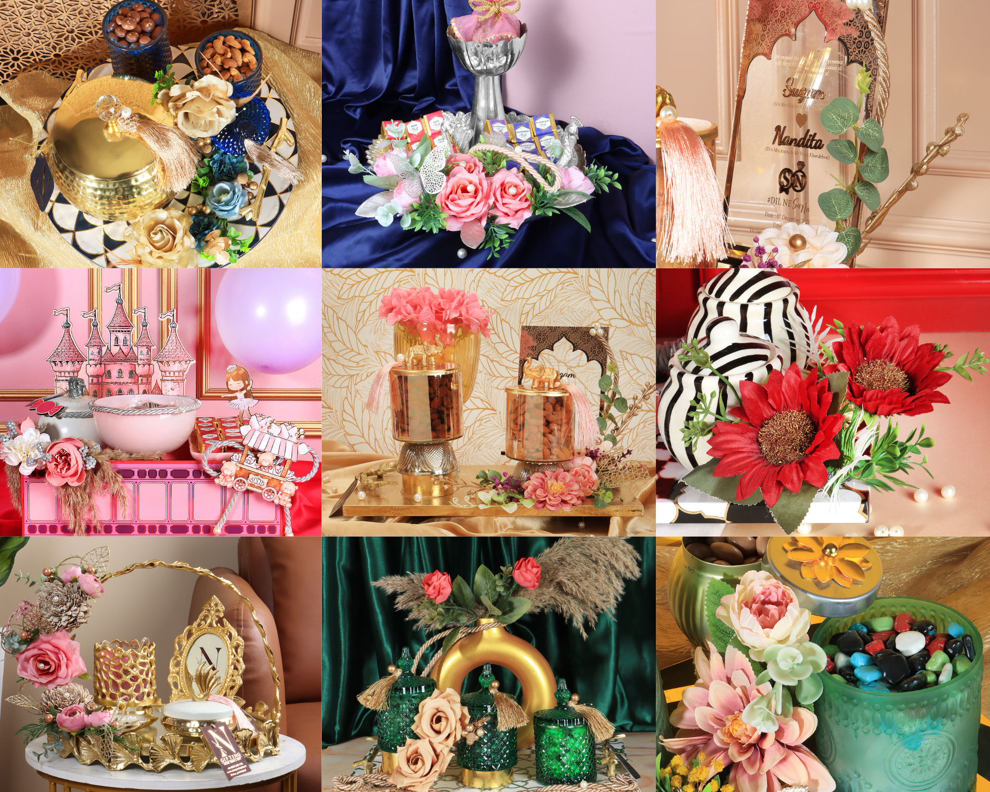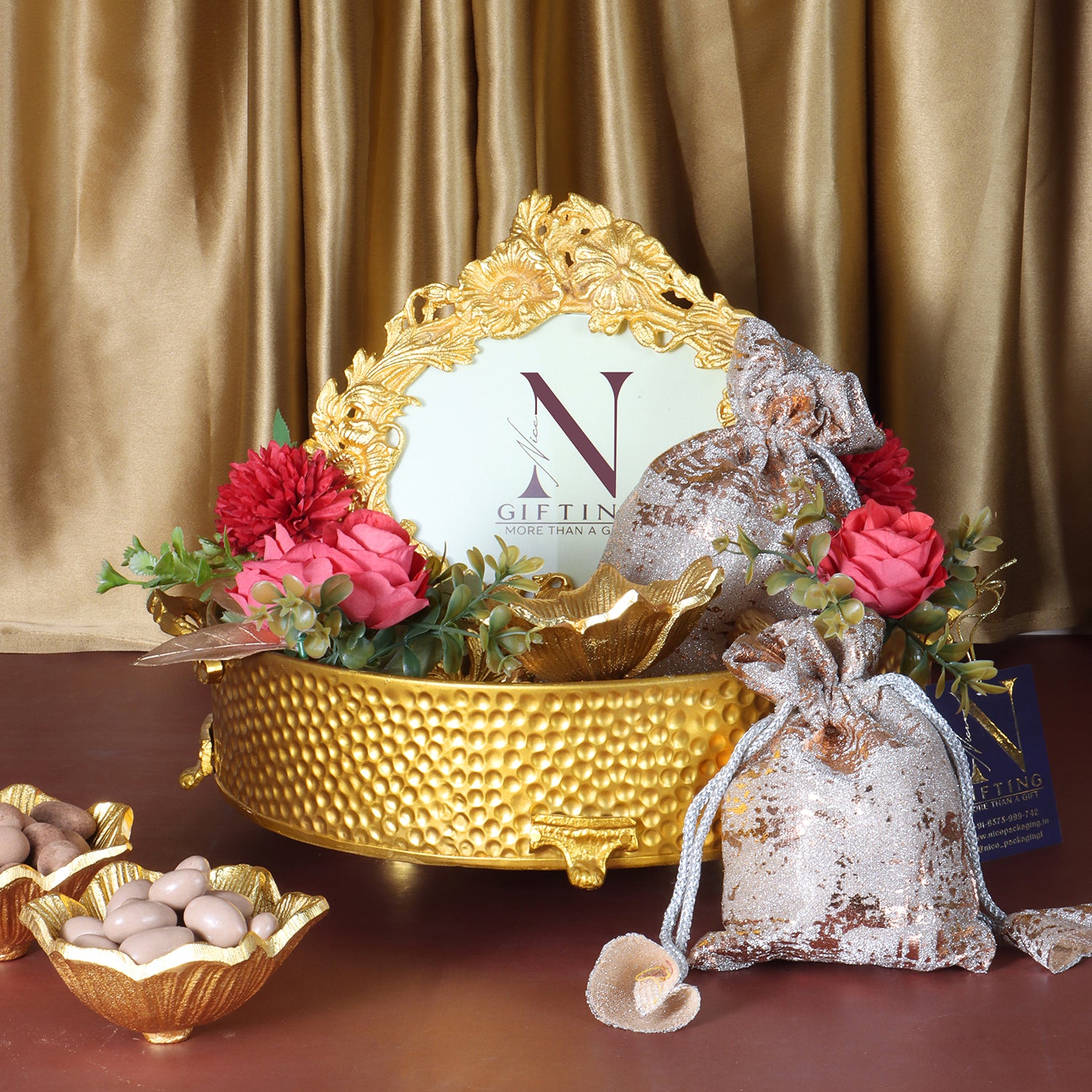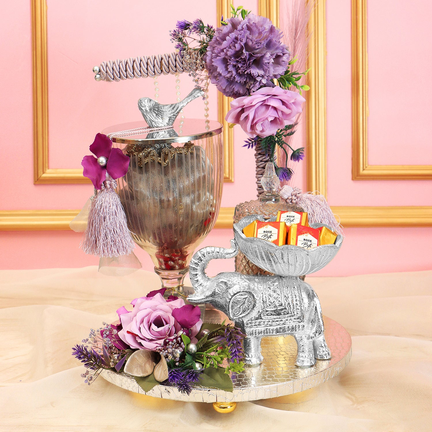 This gifting tray comes with 1 glass vase adorned with silver organza potli and filled with Chocolate Pan Shots, 1 Silver Brass elephant bowl which comes with 7 flavored bites, and 1 Crystal glass jar with Oreo almonds decorated in our lacquer tray.
