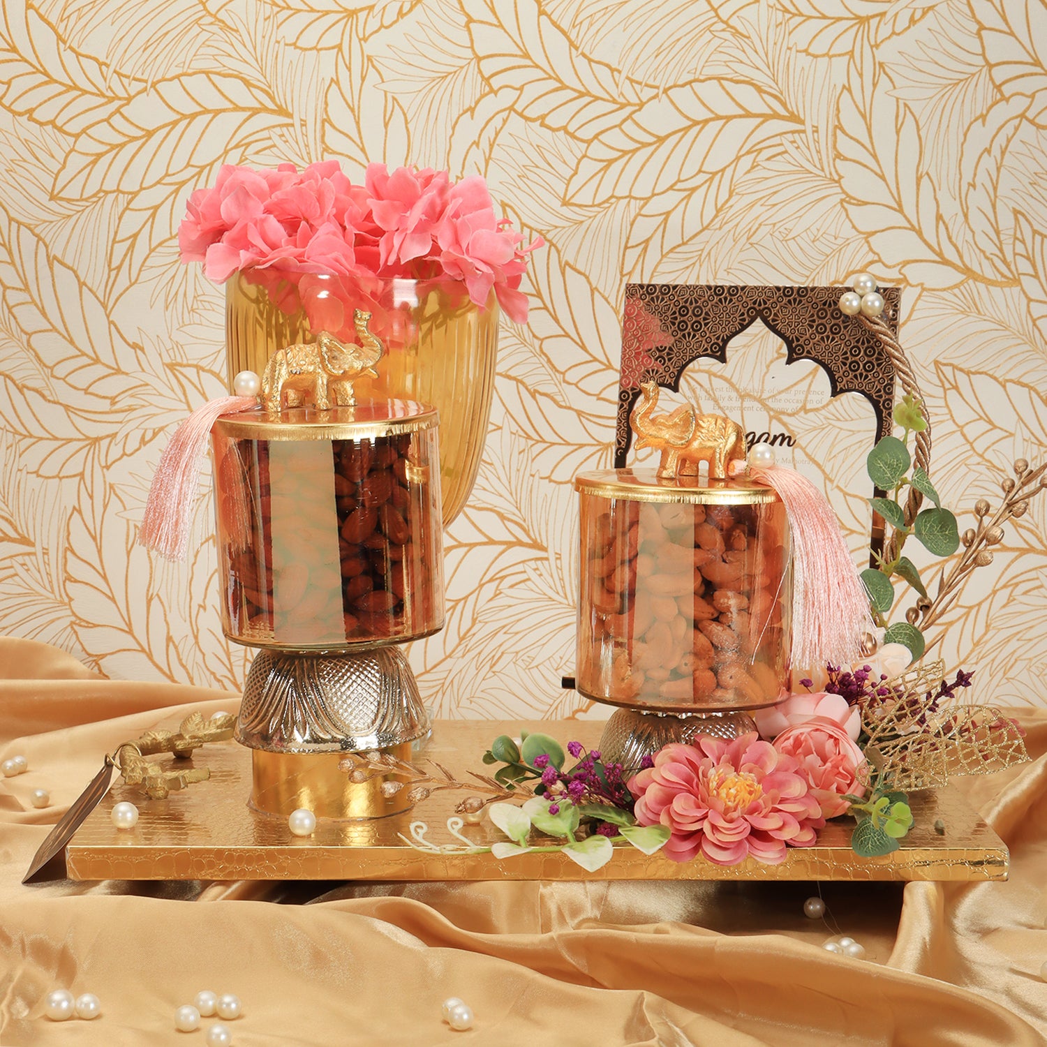This gifting tray hamper set comes with a personalized acrylic wedding invitation and 2 elephant knob glass vases with salted almonds & masala kaju decorated in our rose gold tray.