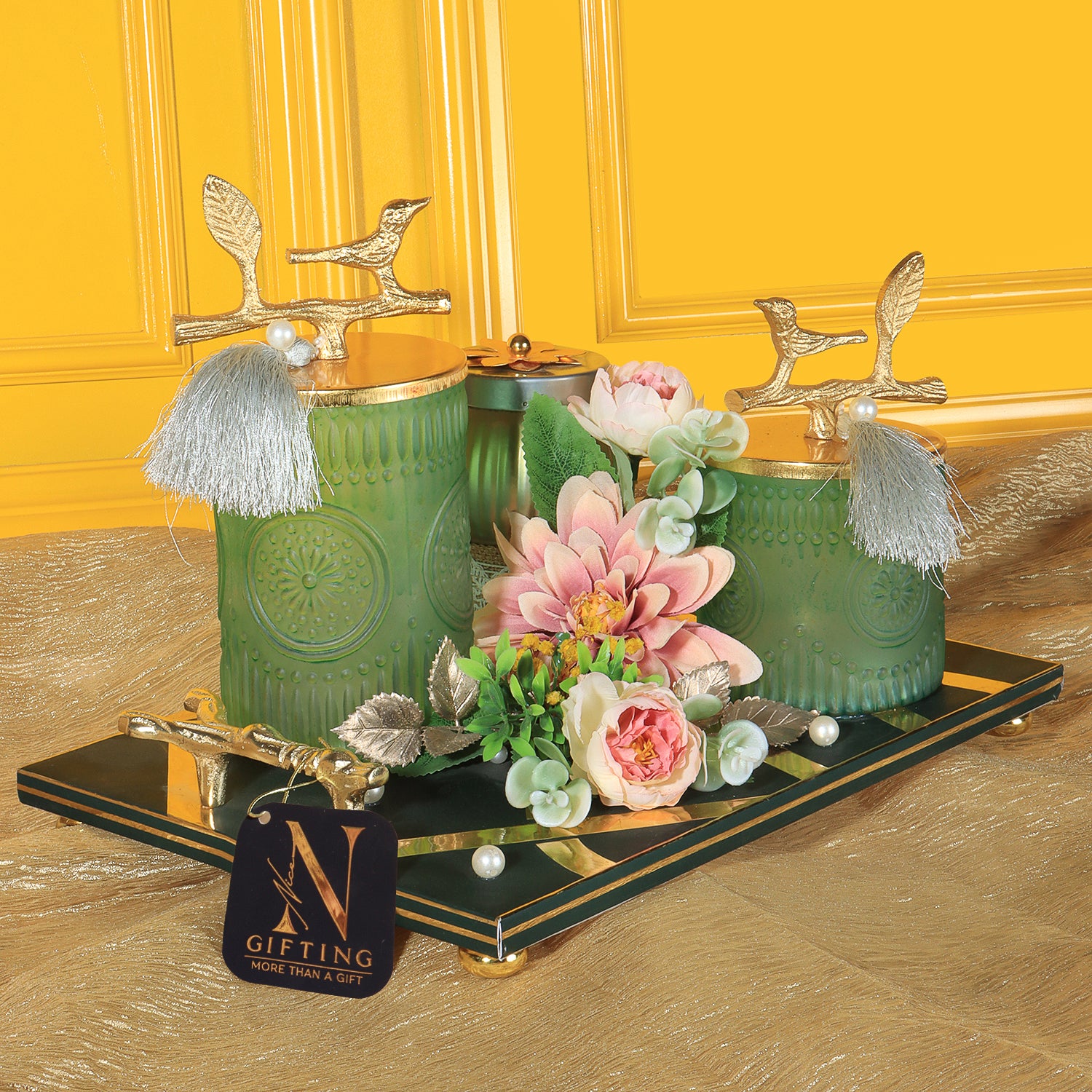 This gifting tray Hamper set comes with a set of 2 gold and emerald jars with a Metal Bird top adorned with a metal jar filled with Choco dusted almonds, Kala khatta raisins, and pista-flavored kaju decorated in our Laqured MDF tray