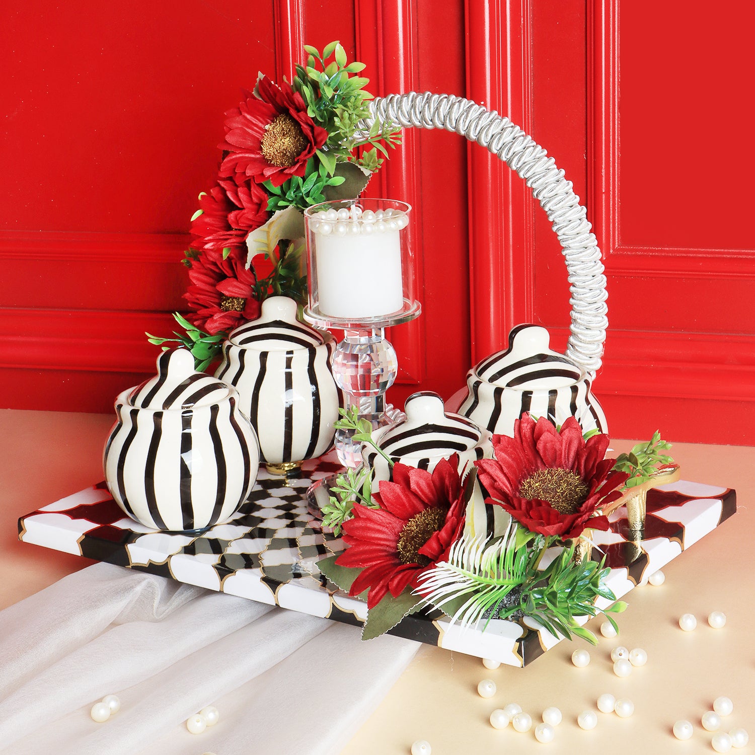 This gifting tray comes with 1 glass candle holder adorned with red flowers & 4 ceramic abstract print jars filled with Oreo almonds , chocolate raisins, Pista flavored Cashew and Munchy masala cashew decorated in our tray.